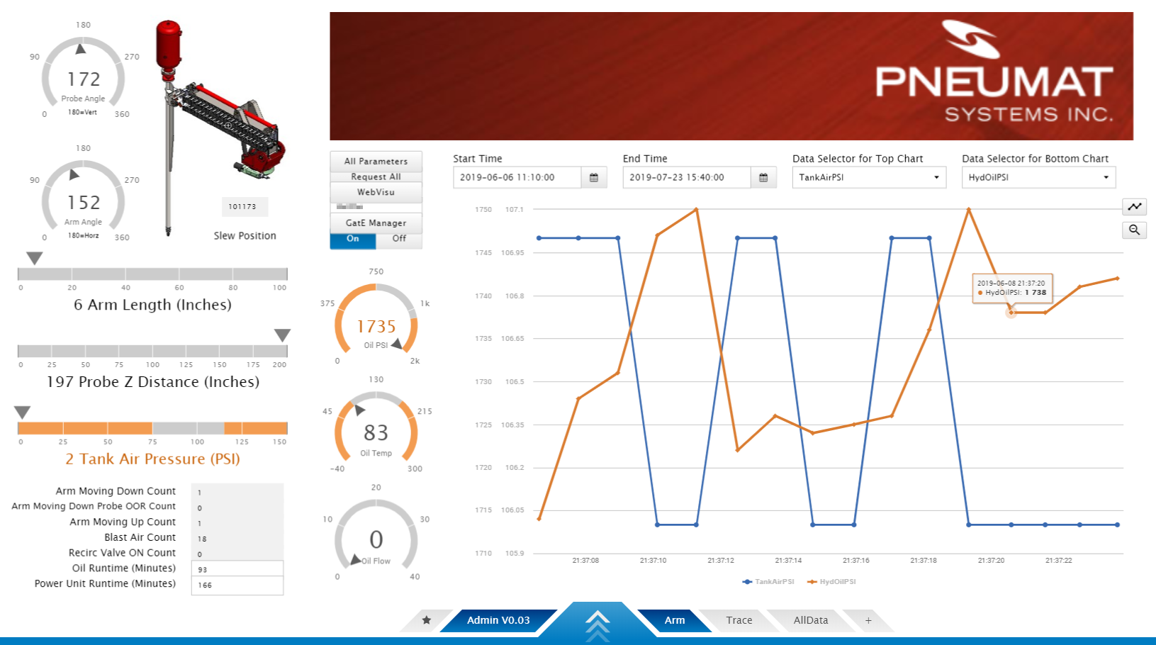 Pneumat Systems has developed a faster, safer way to speed hopper unloading by combining the technologies of hydraulics, pneumatics and telematics in a new device called the Hopper Popper. Hydraulics, including SP10-47 four-way proportional valves, are used to drive the blast probe down into the hardened material. Compressed air is used to safely “fluidize” the material, enabling it to flow, while minimizing potential damage to the hopper and vehicle. Use of telematics, wireless control, and communication with various sensors via CAN bus provide precise motion control. Working with Power Systems, their fluid power distributor, Pneumat was able to configure the Hopper Popper using CODESYS software to log data and enable remote software updates and troubleshooting. Power Systems recommended adding a HydraForce ERAU-6200 Remote Access Unit to the existing hardware to enable this remote access.