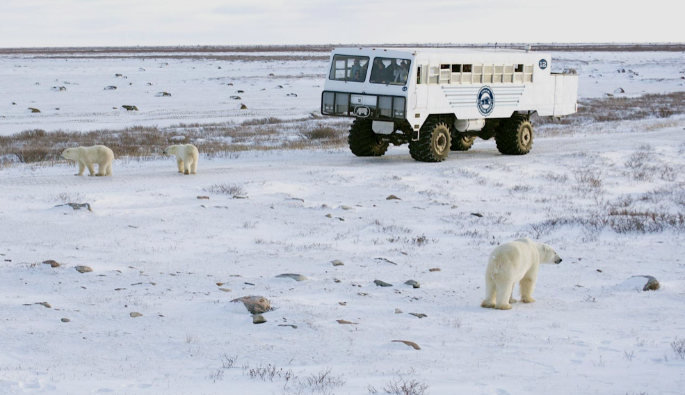 An electric Tundra Buggy moves silently among the polar bears, allowing guests to view and photograph them at close range in warmth and safety.