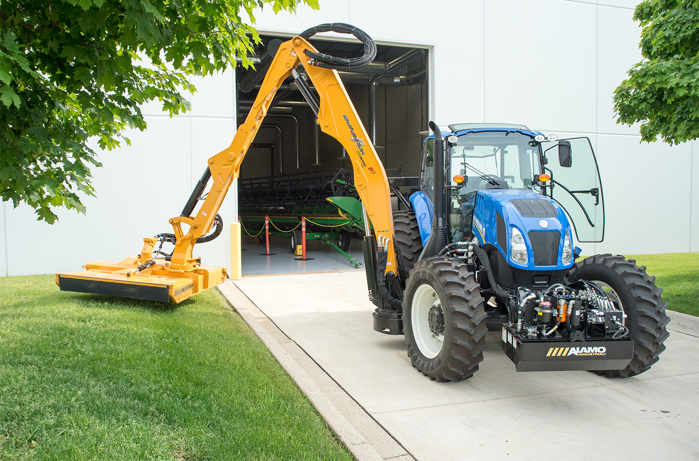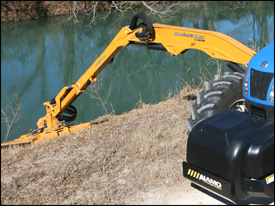 The Maverick™ boom mower, made by Alamo Industrial®, has the ability to reach up to 30 feet to mow down steep slopes, over guard rails, around waterways, or high up into trees. That’s the long of it. This mower, which is mounted on a tractor, also has a 180 degree swing, and can mow in tight spaces within 6 inches of the tires. That’s the short of it. All that capability is controlled by hydraulics, and Alamo prides itself on making the hydraulics on its Maverick mower very simple and easy to control. They also value having the mower hydraulics self-contained and not dependent on the hydraulic system of the tractor.